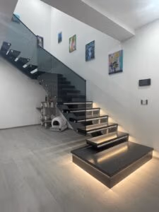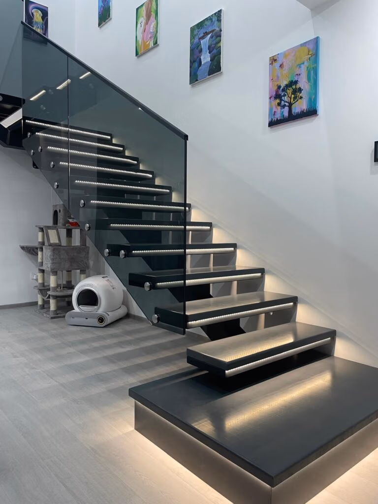 Opțiuni Extra: Pentru un plus de siguranță și efect vizual, putem adăuga sisteme de iluminare integrate în structura scării.